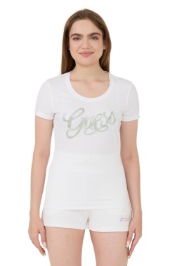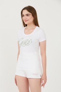 White women's beaded Script Tee, by Guess.