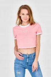 Women's short t-shirt in pink with white accents.