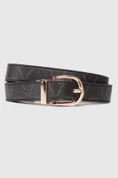 Two-sided women's belt with gold swivel buckle. One side black in logo. The other side in black.