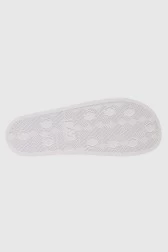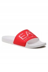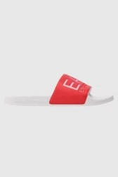 Coral and white flip-flops with white EA7 logo.