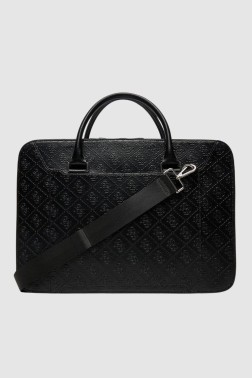 Czarna torba na laptopa marki Guess. Torba zamykana na zamek. Wewnątrz 6 kieszeni wsuwanych i 1 zasuwana, z zewnątrz 2 kieszenie zasuwane i 1 wsuwana. Posiada rączki o wysokości 10 cm oraz regulowany pasek 98 cm. W zestawie woreczek przeciwkurzowy.
