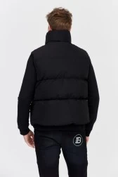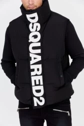 Puchowy bezrękawnik męski DSQUARED2 w kolorze czarnym. Wzdłuż zapięcia duże, białe logo. Zapinany na dwubiegowy suwak oraz rzep. Z przodu dwie kieszenie na zatrzask. Wewnątrz jedna kieszeń na zatrzask.