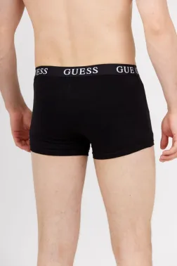 Trzy pary męskich bokserek GUESS z bawełny wykończone czarną gumą z białym logo.