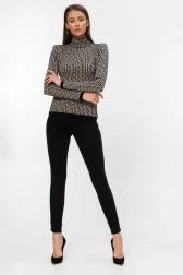 Bluzka z dzianiny w kolorze kości słoniowej w czarny monogram Balmain. Ze stójką i z poduszkami na ramionach. Długie rękawy oraz dół wykończony czarnym ściągaczem.