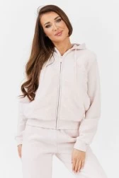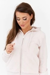 Rozpinana, pluszowa bluza damska w kolorze różowym. Z przodu małe, wyszywane logo. Z tyłu aplikacja z większym logo. Po bokach dwie, wsuwane kieszenie. Kaptur ściągany sznurkami. Dół i rękawy zakończone prążkowanym ściągaczem.