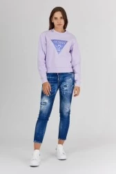 Bluza damska GUESS w kolorze jasnego fioletu. Z przodu aplikacja z wyszywanym logo. Mankiety i dół wykończone prążkowanym ściągaczem.
