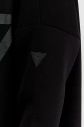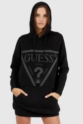 Długa bluza damska GUESS z kapturem w kolorze czarnym. Z przodu duże logo oraz wsuwana kieszeń. Mankiety i dół wykończone ściągaczem.