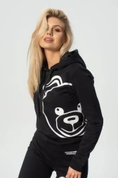 Czarna bluza damska z kapturem oraz dużym nadrukiem misia. Dodatkowo, małe logo firmy na prawym biodrze. Dół i rękawy zakończone ściągaczami.