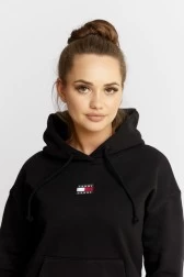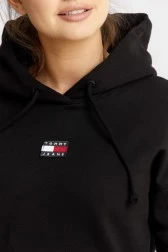 Bluza damska TOMMY JEANS w kolorze czarnym. Z przodu aplikacja z wyszywanym logo oraz duża wsuwana kieszeń. Kaptur ściągany sznurkami. Mankiety i dół wykończone prążkowanym ściągaczem.