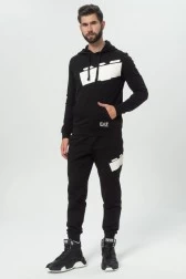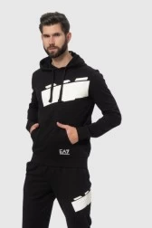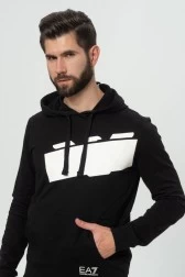 Bluza męska EA7 EMPORIO ARMANI z kapturem w kolorze czarnym. Na piersi duże, białe logo. Duża kieszeń na środku z małym logo. Dół i rękawy zakończone ściągaczami.