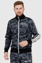 Rozpinana bluza męska PALM ANGELS w kolorze czarnym w szare moro. Na rękawach beżowe lampasy. Z przodu logo w kolorze białym. Bluza zapinana na biały suwak. Z przodu dwie kieszenie na suwak. Dół i rękawy zakończone prążkowanym ściągaczem.