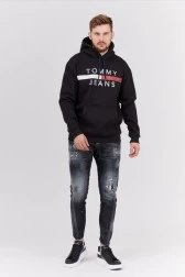 Męska bluza TOMMY JEANS w kolorze czarnym z kapturem. Z przodu odblaskowe logo i wsuwana kieszeń. Dół i rękawy zakończone prążkowanym ściągaczem.