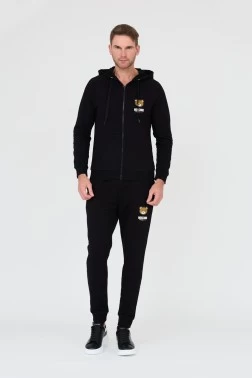 Czarna męska bluza z kapturem, rozpinana, marki Moschino.