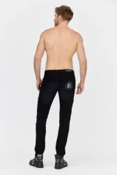 Czarne jeansy męskie BALMAIN zapinane na guziki. Z przodu trzy wsuwane kieszenie oraz dwie ze srebrnymi suwakami. Na udach i kolanach ozdobne przeszycia. Z tyłu dwie wsuwane kieszenie. Na prawej białe logo.