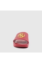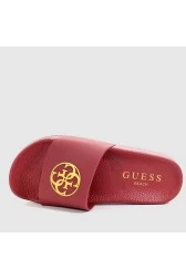 Klapki damskie GUESS w kolorze bordowym ze złotym, okrągłym logo.