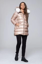 HETREGO Beżowa długa kurtka puchowa Hygiea z lisem