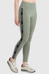 Damskie legginsy GUESS w kolorze zielonym z czarnymi lampasami z logo. Z tyły, od wewnątrz kieszonka na kartę.