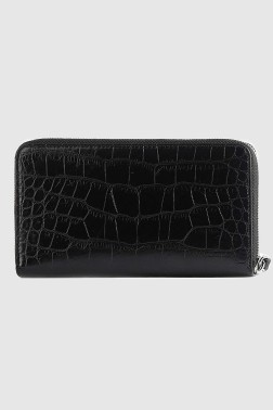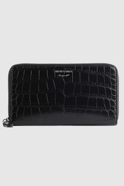 Duży portfel damski EMPORIO ARMANI w kolorze czarnym we wzór krokodyla. Z przodu logo firmy w kolorze srebrnym. Portfel zapinany na zamek. 12 miejsc na karty i 2 przedziały na banknoty. Kieszeń na monety zapinana na zamek.