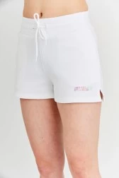 Damskie szorty GUESS w kolorze białym z kolorowym logo. Po bokach wsuwane kieszenie. Elastyczny pas dodatkowo ściągany trokami.
