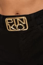 Jeansowe szorty damskie PINKO w kolorze czarnym. Ozdobione paskiem z dużą klamrą z logo w kolorze złotym. Zapinane na zamek. Trzy kieszenie z przodu, dwie z tyłu.