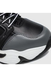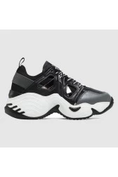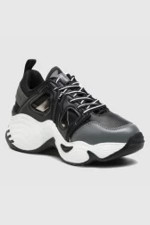 Damskie sneakersy EMPORIO ARMANI w kolorze czarnym na białej, masywnej podeszwie. Cholewka o różnorodnej fakturze. Elementy skórzane w kolorach czarnym i szarym, czarny materiał oraz srebrne wstawki. Wokół pięty plastikowa taśma z logo w kolorze szarym.
