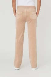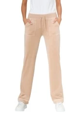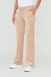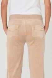 Beżowe spodnie damskie Del Ray marki JUICY COUTURE. Wykonane z przyjemnego weluru, zapewniają wyjątkowy komfort noszenia. Na przedniej części spodni znajduje się małe haftowane logo, dodające subtelnej elegancji. Z tyłu znajdują się dwie zapinane kieszenie.
