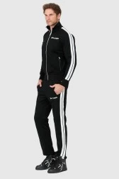 Męskie spodnie dresowe PALM ANGELS w kolorze czarnym. Po bokach białe lampasy. Z przodu białe logo i wsuwane kieszenie. Elastyczny pas. Nogawki z krótkimi suwakami po bokach.
