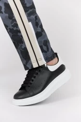 Męskie spodnie dresowe w szaro-czarne moro. Po bokach beżowe lampasy. Z przodu białe logo i wsuwane kieszenie. Elastyczny pas. Nogawki z krótkimi suwakami po bokach.