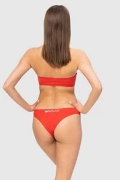 Komplet bikini w kolorze czerwonym. Biustonosz bandeau bez fiszbin z dużym białym logo. Dół od bikini w typie brazilian z białym logo z tyłu.