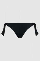 Komplet bikini w kolorze czarnym. Biustonosz ze srebrnym logo, wiązany z tyłu. Lekko usztywniane miseczki, bez fiszbin. Regulowane i odczepiane ramiączko do założenia na szyję. Dół od bikini w typie brazilian z małym srebrnym logo z tyłu i wiązaniami po bokach.