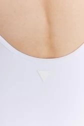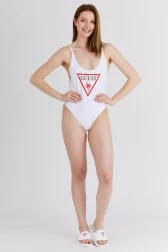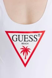 Jednoczęściowy strój kąpielowy GUESS w kolorze białym. Z przodu nadruk z trójkątnym logo. Z tyłu mała aplikacja z logo. Regulowane ramiączka.