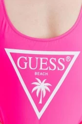 Jednoczęściowy strój kąpielowy GUESS w kolorze neonowego różu. Z przodu nadruk z trójkątnym logo. Z tyłu mała aplikacja z logo. Regulowane ramiączka.