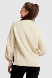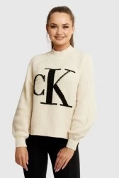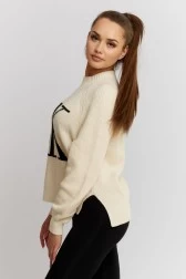 Sweter damski CALVIN KLEIN JEANS ze stójką w kolorze ecru. Z przodu duże czarne logo. Po bokach rozcięcia. Mankiety i dół wykończone prążkowanym ściągaczem.