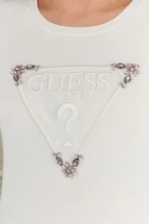Sweterek damski GUESS w kolorze kremowej bieli. Z przodu wyszywane trójkątne logo z kryształkami. Mankiety i dół wykończone prążkowanym ściągaczem.