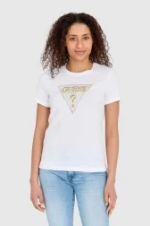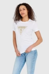GUESS Biały t-shirt damski ze złotym haftowanym cyrkoniami logotypem slim fit