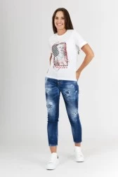 Damski t-shirt GUESS w kolorze białym. Z przodu duży nadruk z modelką. Wywinięte rękawki.