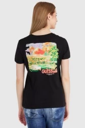 Damski t-shirt GUESS w kolorze czarnym. Z przodu mały nadruk z logo. Z tyłu duży, kolorowy nadruk.