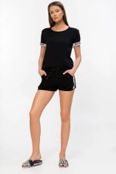 T-shirt damski MOSCHINO UNDERWEAR w kolorze czarnym. Ozdobiony biało-czerwoną taśmą z czarnym logo firmy na ramionach oraz przy wykończeniu rękawków. Na karku małe, białe logo. Okrągły prążkowany dekolt.