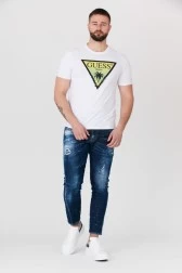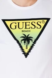 Męski t-shirt GUESS w kolorze białym. Z przodu trójkątny nadruk z logo z palmą.