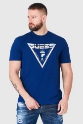 Męski t-shirt GUESS w kolorze granatowym. Z przodu duże trójkątne logo w moro.