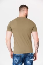 Męski t-shirt GUESS w kolorze khaki w serek. Z przodu aplikacja z małym logo.