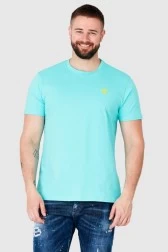 Męski t-shirt GUESS w kolorze turkusowym. Z przodu aplikacja z żółtym logo.