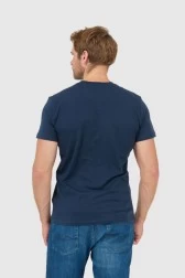 T-shirt męski w kolorze ciemnogranatowym. Z przodu nadruk z dużym, szarym logo. Okrągły, prążkowany dekolt.