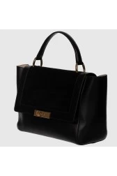 Torebka Escada średniej wielkości (mieszcząca A4) w kolorze czarnym. Okucia w kolorze złotym. Elegancki design. Wykonana z naturalnej skóry licowej oraz skóry naturalnej zamszowej. Z przodu logo marki w kolorze złotym. Pojedyncza rączka. Zapięcie na zatrzask. Wewnętrzna kieszeń zapinana na zamek. Wnętrze torebki wykonane z naturalnej skóry zamszowej w kolorze beżowym.