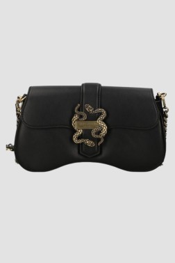 Czarna torebka RANGE A NEW ICONIC SNAKES, marki Just Cavalli. Torebka wykonana ze skóry ekologicznej, posiada nieregulowany pasek o długości 100 cm. Wewnątrz znajdują się 4 komory: 3 wsuwane, 1 zasuwana na zamek oraz 1 wsuwana kieszeń. W zastawie worek przeciwkurzowy.