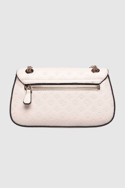 Beżowa logowana torebka Arlena marki Guess. Klapa zamykana na magnes, wewnątrz jedna kieszeń zasuwana, jedna wsuwana i sześć miejsc na karty. W zestawie woreczek przeciwkurzowy.