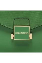 Mały zielony kuferek z ozdobnym logo VALENTINO. Klapa zamykana na zatrzask, komora zasuwana na zamek. W środku jedna kieszeń na suwak i przegródka.