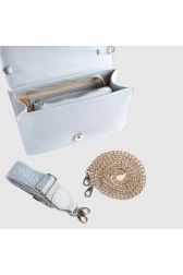 Błękitna torebka z blado-złotym logo. Tłoczona klapa zamykana na zatrzask, komora zasuwana na zamek. Wewnątrz jedna kieszeń na suwak oraz dwie wsuwane.