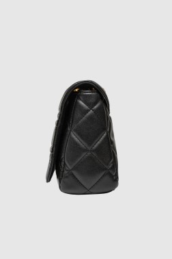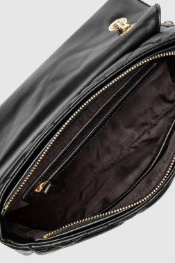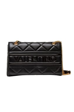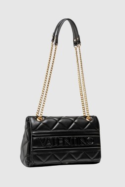Pikowana czarna listonoszka Ada z czarnym logo, marki Valentino by Mario Valentino, na złotym łańcuszku. Klapa zamykana na zatrzask, komora na zamek. Wewnątrz jedna kieszeń wsuwana oraz jedna zasuwana. Można ją nosić w ręku (wysokość uchwytów 33 cm) lub na ramieniu (58 cm) z niską rączką (7 cm). W zestawie woreczek przeciwkurzowy.