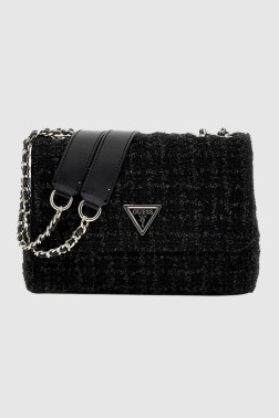 Czarna materiałowa torebka Giully 2 marki Guess z domieszką wełny. Torebka zamykana na dwa magnesy. Wewnątrz dwie komory, zasuwana kieszeń oraz sześć miejsc na karty. Spód torebki chronią nóżki. Z tyłu torebki dodatkowa zasuwana kieszeń. W zestawie woreczek przeciwkurzowy.